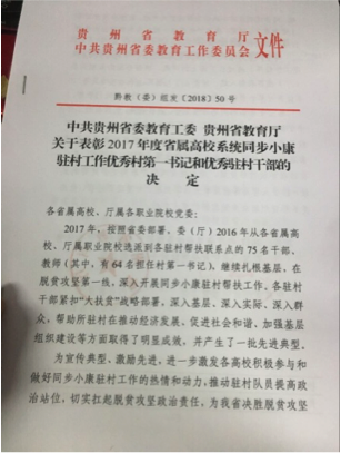 本网讯(电气与信息工程学院 刘帆/文)近日,中共贵州省委教育工委、贵州省教育厅联合下发《关于表彰2017年度省属高校系统同步小康驻村工作优秀村第一书记和优秀驻村干部的决定》(黔教(委)组发〔2018〕50号),我校电气与信息工程学院驻湄潭县复兴镇新金龙村驻村干部、村“第一书记”苏凡竣老师荣获“2017年度省属高校系统同步小康驻村工作优秀驻村干部”称号。