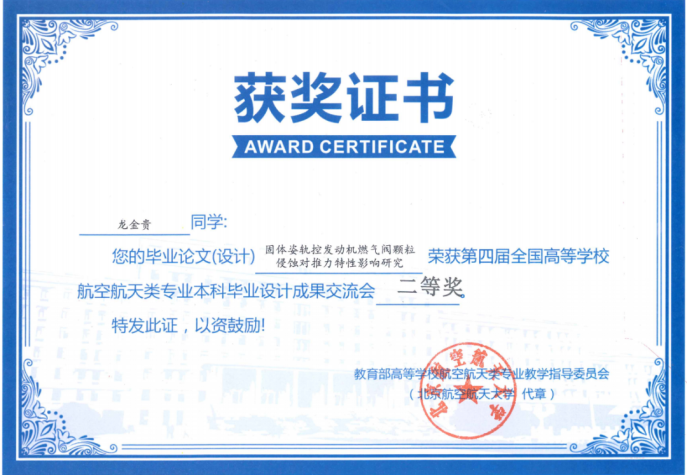 本网讯(航空航天工程学院)2023年5月27日,第四届全国高校航空航天类专业本科毕业设计成果交流会在电子科技大学清水河校区举行。来自清华大学、上海交通大学、西北工业大学、北京航空航天大学、北京理工大学、哈尔滨工业大学、国防科技大学、贵州理工学院等40余所全国航空航天类高等院校315个项目参与交流评比。经过激烈角逐,层层选拔,我校航空航天工程学院龙金贵同学获二等奖,李卓、杨稳和刘航三位同学分别获优秀奖。这是我校毕业生参加全国航空航天类专业本科毕业设计成果首次获得此项荣誉。