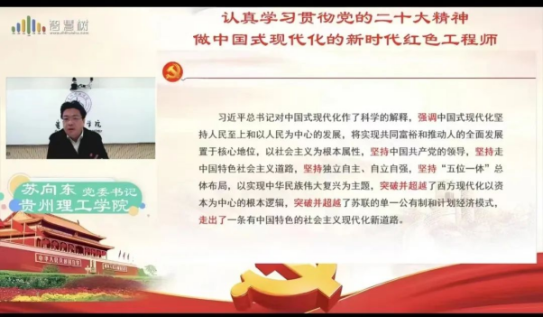 苏向东以《认真学习贯彻党的二十大精神做中国式现代化的新时代红色工程师》为题,从“勿忘昨天:中国式现代化的实践探索”“无愧今天:中国式现代化的实践解码”“不负明天:中国式现代化的实践路径”三个方面向全体学生深刻阐述了中国式现代化重要意义。苏向东在授课时说,青年强,则国强,作为贵州理工学院学生,要坚持以党的二十大精神为引领,赓续“工程师摇篮”红色血脉,立足国家和民族长远发展,做中国式现代化建设的新时代“红色工程师”。要锤炼鲜明的政治品格,始终如一坚守理想信念,做理想远大、信念坚定的模范,做刻苦学习、锐意创新的模范,做艰苦奋斗、无私奉献的模范,做崇德向善、严守纪律的模范。要努力塑造多元的知识结构,锻造突出的工程实践能力,培养较强的创新意识,提高适应社会的能力。激励同学们作为一名新时代的大学生,勿忘昨天的苦难辉煌,无愧今天的使命担当,不负明天的伟大梦想。