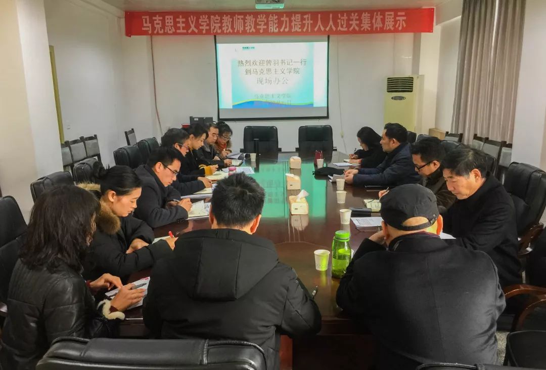 本网讯 为进一步贯彻落实中共中央、国务院《关于加强和改进新形势下高校思想政治工作的意见》、教育部《高等学校思想政治理论课设标准》《高等学校马克思主义学院建设标准(2017年本)》精神,2018年12 月21日下午,校党委书记曾羽率党委办公室、组织部、教务处、人事处、科技处、计划财务处相关负责人到马克思主义学院现场办公,着力解决马克思主义学院建设发展中遇到的困难和问题,为建设具有理工特色的新时代思想政治理论课程问诊把脉,解决实际问题。