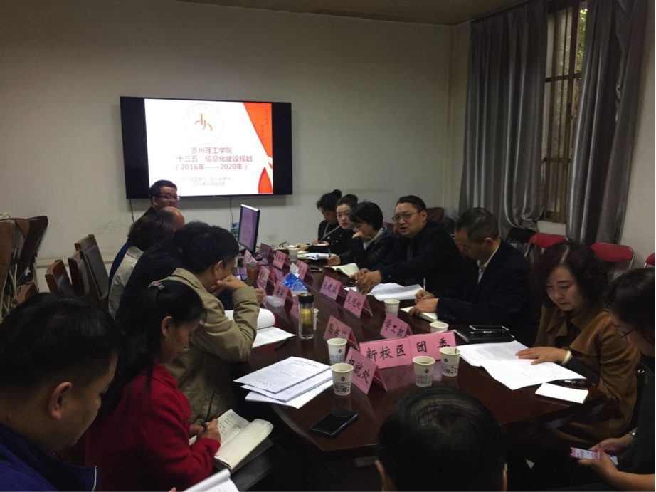 本网讯(发展规划与对外合作处 冉景榆/文图 )为进一步完善我校“十三五”教育事业发展规划内容体系,更好地推进我校信息化建设和校园建设,10月16日上午,副院长宋建波在信息网络中心一楼会议室主持召开“十三五”信息化建设规划和校园建设规划集中论证会议。贵州民族大学网络中心主任吴军、贵州医科大学网络中心主任刘涛、贵州省城乡规划设计研究院总工程师王建国等专家应邀出席会议。学校相关部门及新校区建设指挥部工程部的负责同志或相关工作人员参加会议。