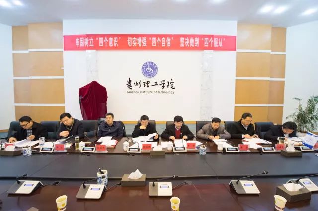本网讯(宣传部 金敏/文 陈智海 邹坤/图)根据中央、省委关于开好2017年度县以上党和国家机关党员领导干部民主生活会的统一安排部署和要求,1月24日上午,在喀斯特会议厅学校党委领导班子召开了以“认真学习领会习近平新时代中国特色社会主义思想,坚定维护以习近平同志为核心的党中央权威和集中统一领导,全面贯彻落实党的十九大各项决策部署”为主题的2017年度民主生活会。省教育厅副厅长级督学、省委教育工委委员何秀黔及省教育厅相关人员到会指导。党员校领导曾羽、龙奋杰、张波、王建平、宋建波、苏向东参加会议,副校长梁杰、部分中层领导干部及教职工代表列席会议。会议由校党委书记曾羽主持。