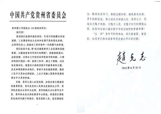 2014年“五四”前夕,我院机自132班全体同学向时任贵州省委书记赵克志写信,汇报学习情况,获赵克志书记回信。克志书记勉励同学们好好学习、立志成才,给学生极大鼓励,学院学风从此步入良性轨道。2015年“五四”青年节,克志书记亲临贵州理工学院,与青年学子共话发展,更加激励了学院的学风建设工作。