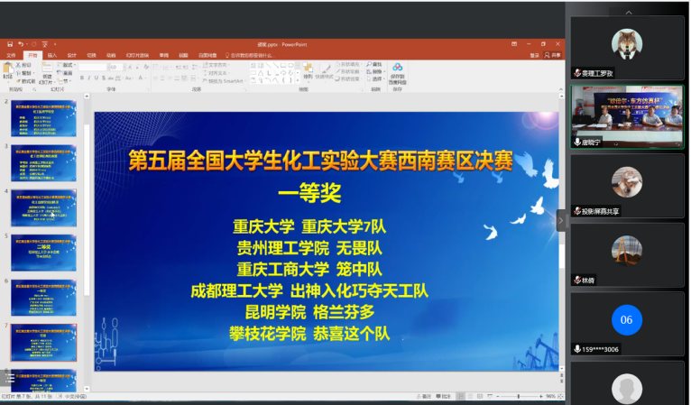本网讯 7月9日至11日,第五届全国大学生化工实验大赛西南赛区决赛在昆明理工大学举行。本届比赛采用线上远程操作形式进行,通过远程初赛选拔,来自2019级化学工程与工艺专业的两支参赛队进入西南赛区决赛,最终邱进、谢爽、宋得菊组成的“无畏队”获得一等奖,杨廷龙、刘德育、刘盛琴获得二等奖,宋得菊获得“仿真单项奖”,贵州理工学院获得“优秀组织奖”。