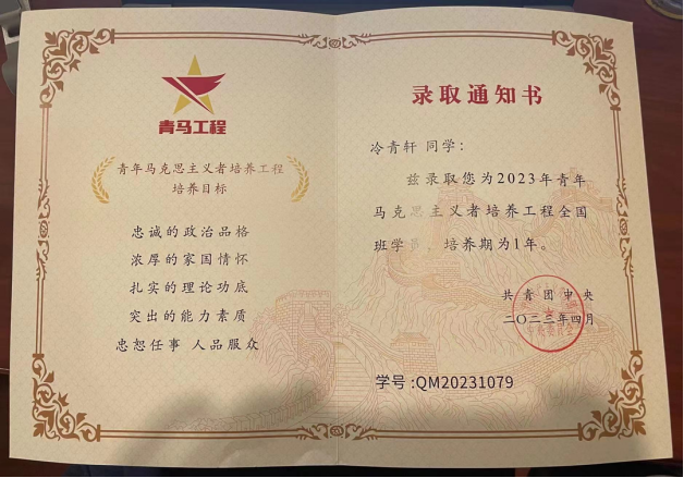 本网讯(校团委) 2023年全国青马工程开设高校班、农村班、国企班、社会组织班、少先队工作者班。其中,高校班由团中央组织部、教育部思想政治工作司共同组织实施。经组织推荐、资格审查、比选择优、差额选拔、组织考察等环节,贵州省第八期“黔青英才”大学生骨干培训班优秀学员、学校第三期“青马工程”学员、人工智能与电气工程学院冷青轩同学作为贵州省2名学生代表之一成功入选2023年全国青年马克思主义者培养工程高校班,这是我校学子首次入选全国“青马工程”高校班。