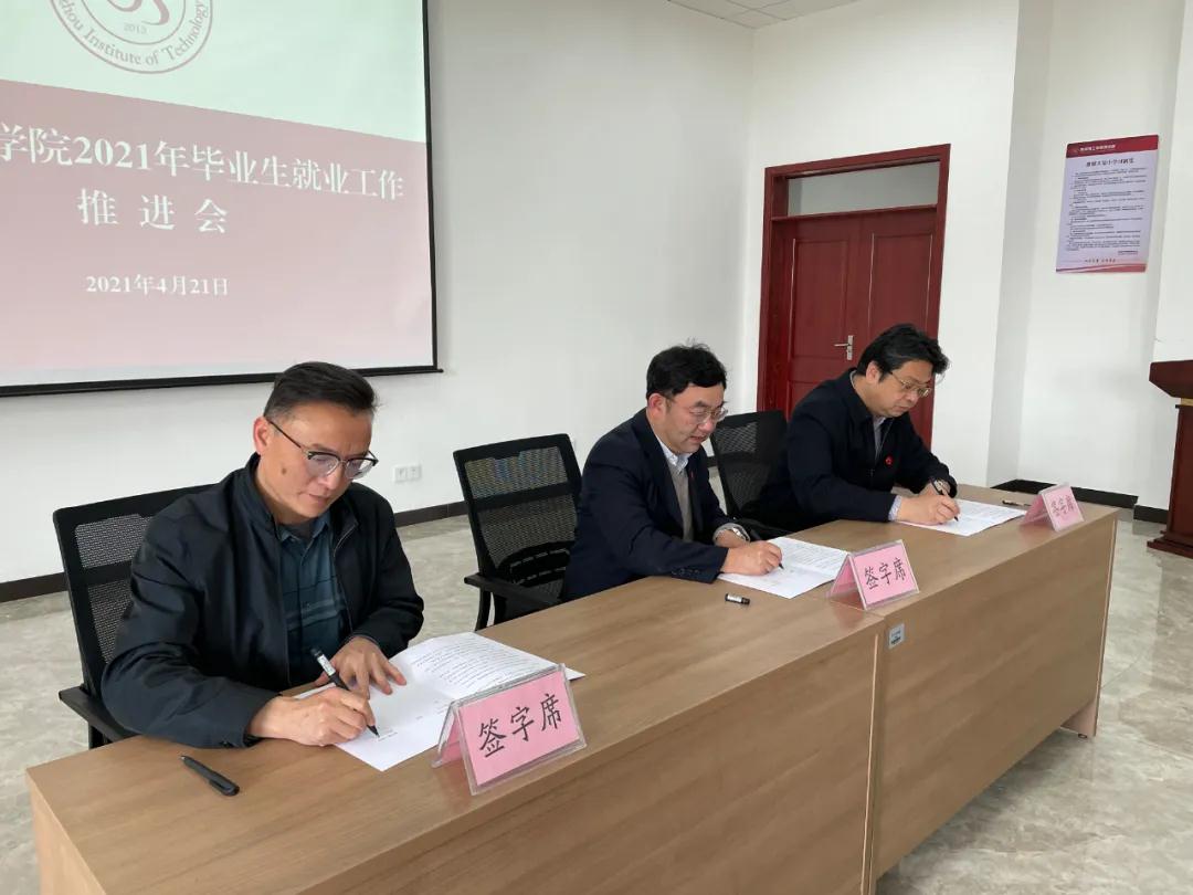会上,曾羽、苏向东与副校长张开智签订了2021年就业工作目标任务书。张开智分别与招生就业处和毕业生学院签订就业工作目标任务书,传达学习了上级有关就业工作文件精神,通报了各学院2021届毕业生就业情况,并对我校2021年毕业生下阶段就业工作作出部署。