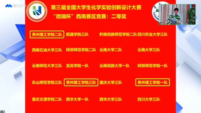 7月18日至19日,第三届全国大学生化学实验创新设计大赛“微瑞杯”西南赛区竞赛线上举行。来自贵州、四川、重庆、云南共计47所高校124支队伍参加,贵州省内7所高校19支队伍进入西南赛区复赛。我校化学工程学院三支队伍全部顺利进入复赛,经过激烈角逐,喜获二等奖!