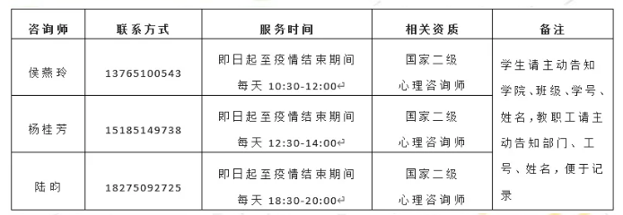 服务时间:即日起至疫情结束期间,每天早10:00-22:00开通群内值班,具体咨询时间根据咨询师及求助者时间确定 。