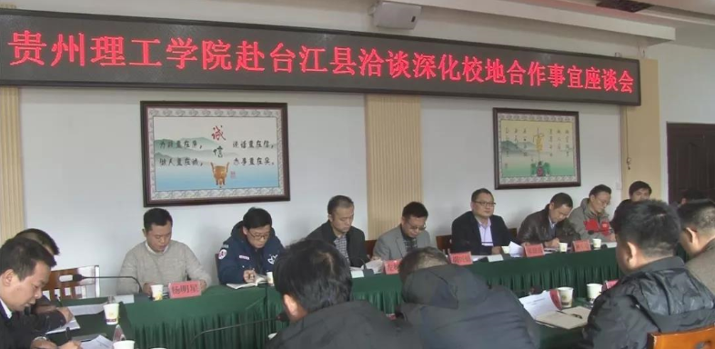 宋建波回顾了校地合作协议自签署以来双方在交流合作中通过不断碰撞、交流和探讨所达成的合作意向和工作措施。他充分肯定了校地合作两年来所取得的工作成绩,并围绕干部挂职、专业技能培训、古村落保护、农产品深加工等内容与台江县领导交换了意见。他希望校地双方能够进一步增进了解、深化友谊,在更多层次、更多领域推进合作,让更多创新资源和生产要素在台江集聚。他表示,贵州理工学院将进一步加强服务台江工作,为助力台江打好脱贫攻坚战贡献理工智慧和理工方案。