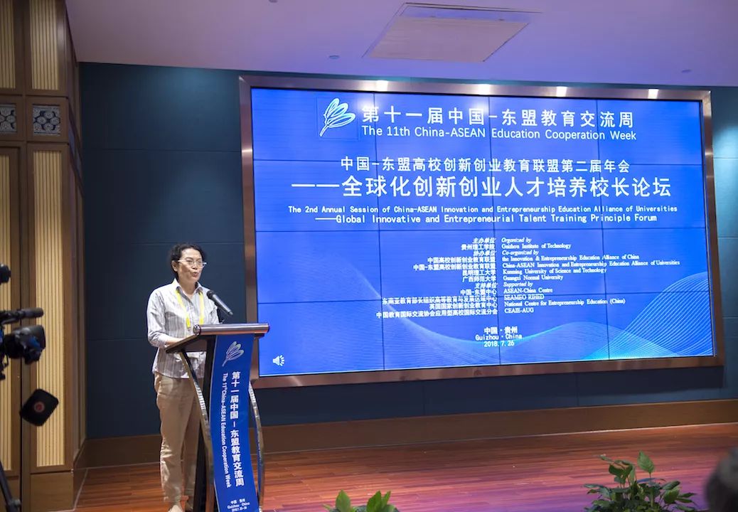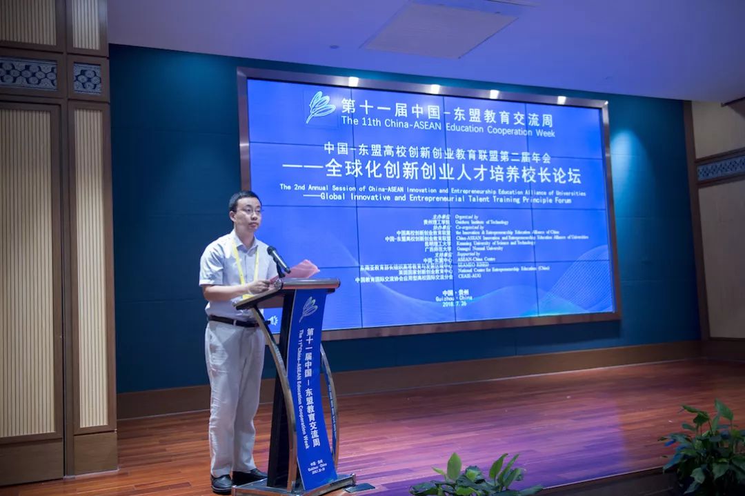 本网讯(党委宣传部 巫敏/文 陈智海 邹坤 秦志颖/图)7月26日,由贵州理工学院主办,中国高校创新创业教育联盟、中国-东盟高校创新创业教育联盟、昆明理工大学、广西师范大学协办的第十一届中国东盟教育交流周开幕期“中国—东盟百名校长牵手未来系列活动”之“中国—东盟高校创新创业教育联盟第二届年会——全球化创新创业人才培养校长论坛”在交流周永久会址二楼红枫厅举行。本次论坛以“协同育人,融合发展——中国—东盟高校创新创业人才培养探索实践”为主题,旨在探索新形势下高校创新创业教育发展思路,“一带一路”背景下高等教育深化改革路径,共同推进高等教育人才培养质量。
