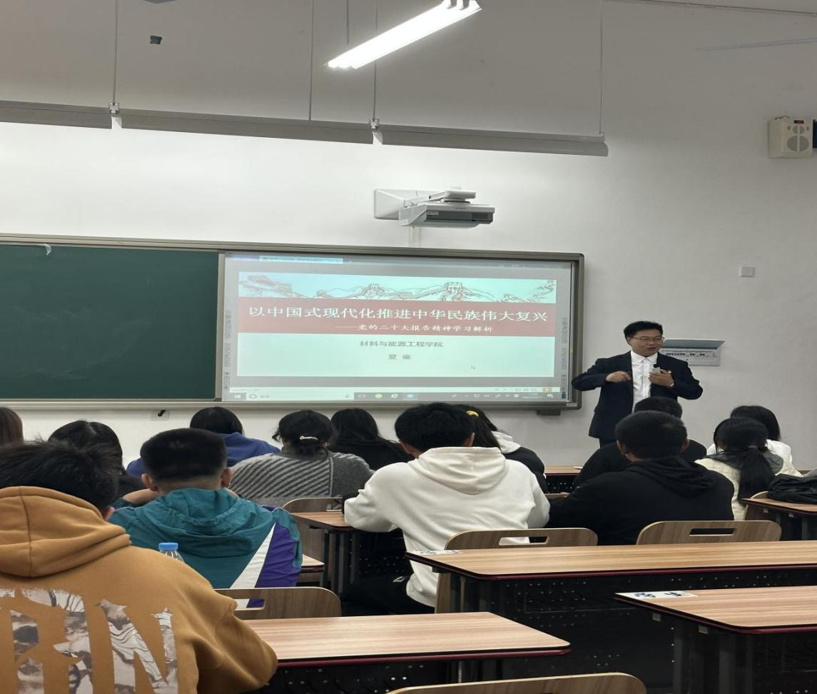本网讯 (交通工程学院 王梦沅)为全面学习贯彻党的二十大精神,深入学习习近平新时代中国特色社会主义思想,2023年10月13日下午,由材料与能源工程学院、交通工程学院、外国语学院和人工智能与电气工程学院共同举办的院级第二期大学生骨干班理论培训在开物楼116教室开讲,材料与能源工程学院党总支副书记夏雍以《以中国式现代化推进中华民族伟大复兴》为题进行理论宣讲,相关学院学生骨干40余人参加聆听。