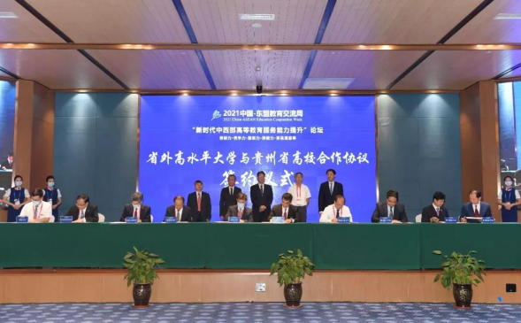 本网讯(学校办公室)2021年9月24日,以“知行合一——共建可持续发展合作的教育愿景”为主题的2021中国—东盟教育交流周在贵安新区开幕。在“新时代中西部高等教育服务能力提升”论坛上,校长苏向东代表贵州理工学院与北京工商大学签署战略合作协议。