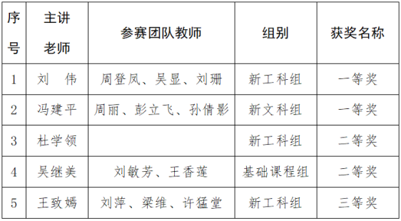 本网讯(教务处)近日,贵州省第三届高校教师教学创新大赛传来喜讯,我校材料与能源工程学院刘伟等5名参赛教师团队在贵州省第三届高校教师教学创新大赛中再创佳绩,分别荣获新工科组一等奖1项、二等奖1项、三等奖1项,新文科组一等奖1项,基础课程组二等奖1项,学校获“优秀组织奖”。
