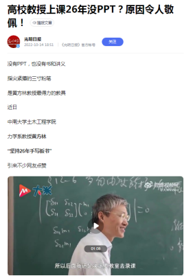据了解,黄方林教授讲课几十年,一直坚持手写板书,教学事迹得到人民日报、光明日报、中国青年报、中国教育报、澎湃新闻、人民网、光明网等全国多家新闻媒体报道,获一致好评。