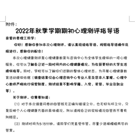 9月13日起,中心组织各学院开展全覆盖心理健康测评。通过线上指导、测评、统计分析,全面掌握学生心理健康水平,及时发现潜在心理危机,主动介入,避免在疫情防控期间发生因心理危机造成的极端事件。