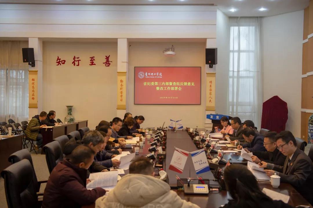 本网讯  为进一步保证省纪委督查整改工作全面落实,推动我校纪检监察工作高质量发展,为学校健康可持续发展提供坚强的纪律保障和政治保障,2019年12月24日,省纪委第三内部督查组反馈意见整改工作部署会在喀斯特会议厅召开,校领导曾羽、梁杰、宋建波、胡兴灿、高勇出席会议,贺梦依主持会议。
