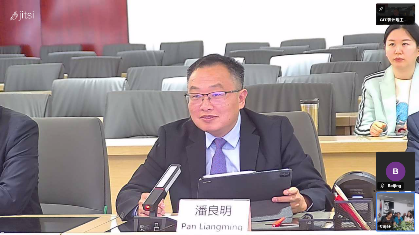 会上,潘良明对哈瓦那科技大学出席线上会议的嘉宾表示欢迎,为古方克服12小时时差对我校的大力支持表达了感谢。双方就中外合作办学机构建设、西班牙语课程教学、师生互派等合作事宜进行了交流讨论。