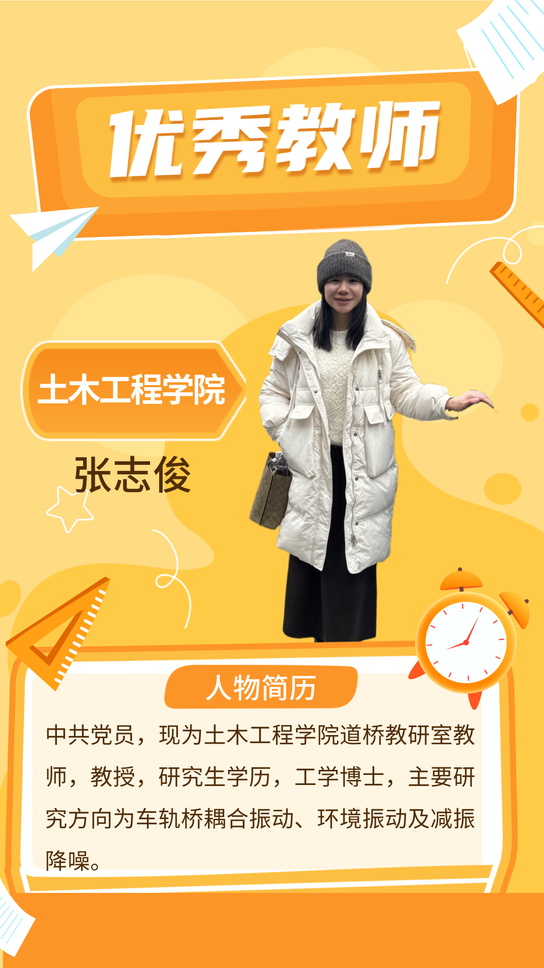 张志俊老师长期从事车轨桥耦合振动、环境振动、工程安全与健康诊治等领域的研究,主持多项国家级和省级科研项目,到账科研经费76万元。以第一(通讯)作者身份发表了30余篇学术论文,其中SCI、EI检索论文高达20余篇。出版学术专著1部,获得软件著作权7项、发明专利2项和实用新型专利12项,部分研究成果已应用到我国轨道交通的设计和建设中。同时,她指导学生获得国家级一等奖1项、三等奖3项,省级奖3项;指导学生的大创项目获得国家级立项1项、省级立项1项;指导的毕业设计4人获得校优秀毕业设计。