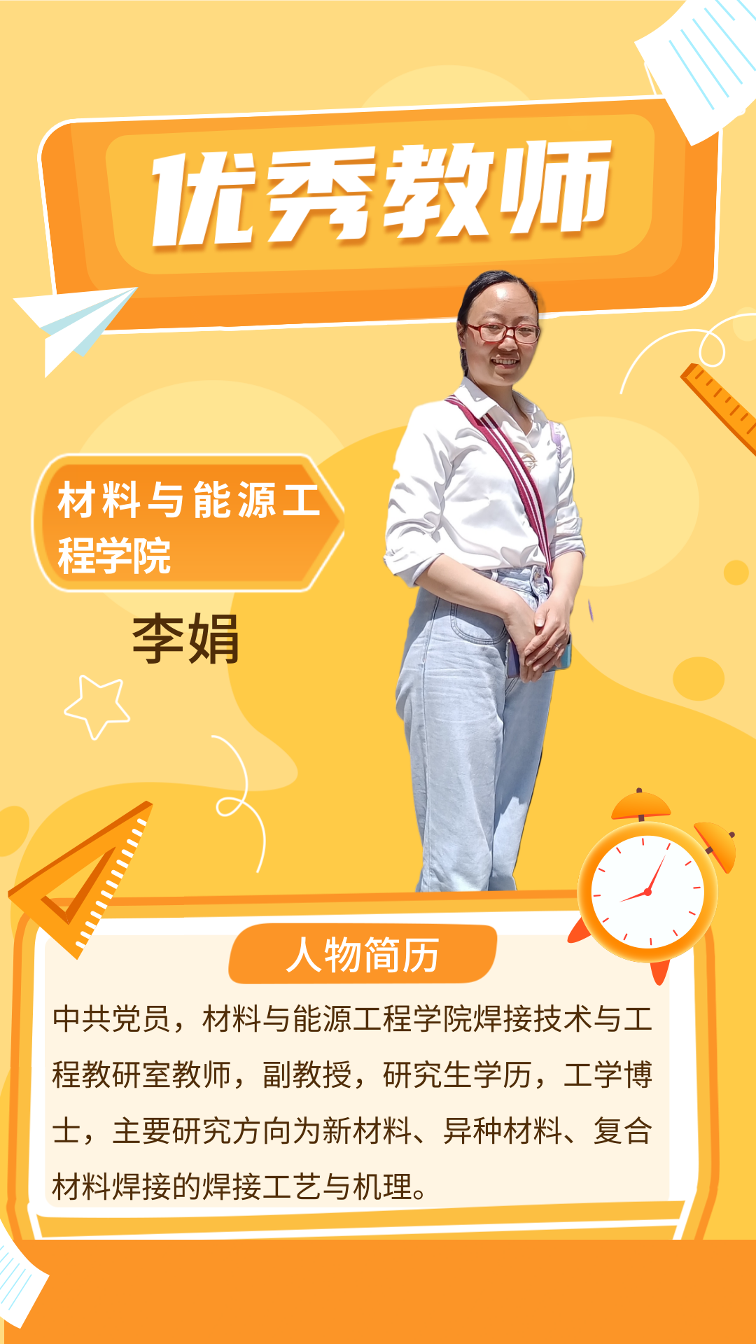 李娟老师近年来先后主持和参与国家级和省部级项目7项,以第一作者或通讯作者发表学术论文20篇,其中SCI/EI收录12篇。申请发明专利7件,授权5件。国际焊接工程师、中国机械工程学会焊接分会钎焊及特种连接专业委员。建设新华网课程思政教学案例1个;获得省级课程思政教学竞赛三等奖1项,获批省级一流课程1门,省级课程思政示范课程(教学名师、教学团队)1项,省级教改项目1项。