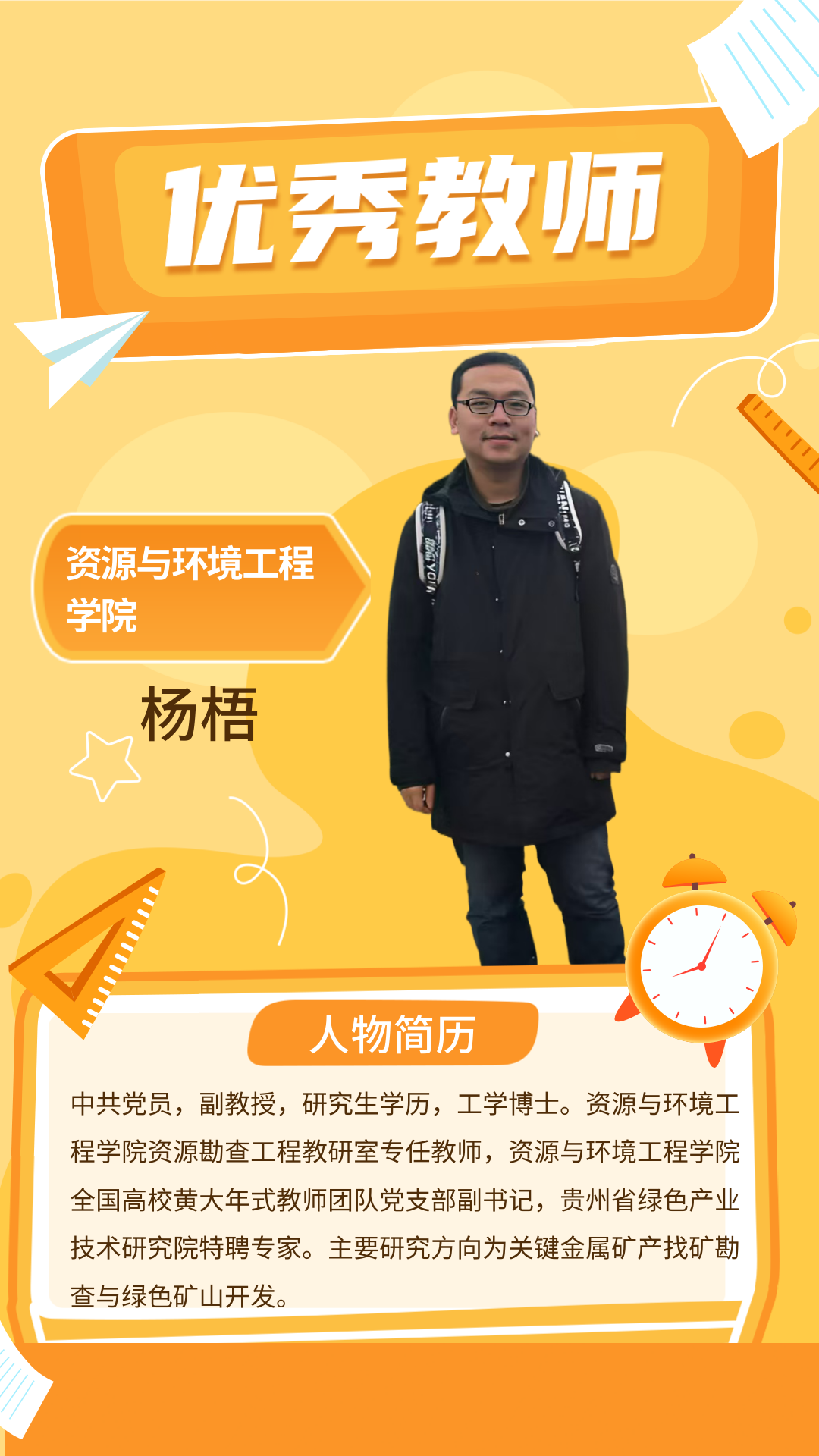 杨梧老师聚焦绿色矿山与碳汇研究主题,近3年主持或参与国家自然科基金项目1项、贵州省科技厅项目1项和省科协项目1项。完成省委重大调研课题项目1项,以第一作者或通讯作者发表高水平论文10篇(其中SCI/SSCI 7篇),发表高质量教学教改论文1篇(SSCI 2区)。2023年获得高校青年教师创新大赛贵州理工校赛三等奖。2023年6月指导学生参加第十八届“挑战杯”全国大学生课外学术科技作品竞赛作品获得贵州省一等奖;指导学生参加“创青春”贵州青年碳中和创新创业大赛,获金奖1项,银奖1项,并获评赛事优秀指导老师。