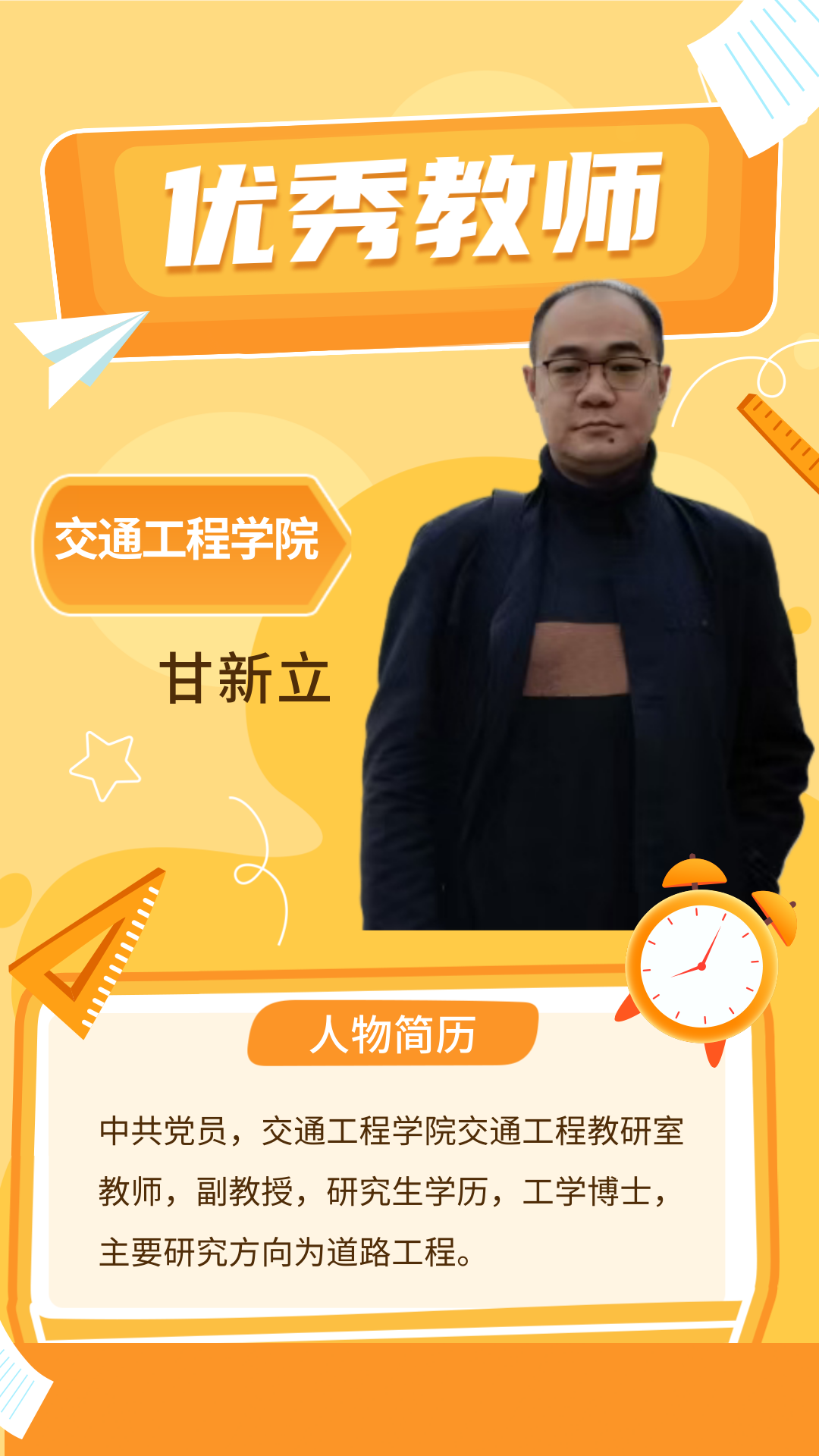 甘新立老师承担贵州省科学技术厅、教育厅、交通运输厅、省公路局科技项目多项;开发了“低碳渗固式抗滑封层应用技术”,获2022年度贵州省公路学会科学技术二等奖,并在贵州省首届科技节上进行了成果推介;依托科学研究,近三年出版学术专著1部,发表SCI检索论文4篇、中文核心期刊论文3篇,获授权发明专利2项、实用新型专利3项,登记软件著作1项,参与编制了开阳县“十四五”综合交通体系有关规划;所获得的科技成果“低碳渗固式抗滑封层”“公路生态袋护坡”等技术成功获得了工程应用。指导学生获得了“中交公规院杯”2022世界大学生桥梁设计大赛入围奖1项、中国(小谷围)“互联网+交通运输”创新创业大赛三等奖1项。他和课程团队在“智慧树网”建设并上线了国内第一门《道路工程》线上课程资源;《道路工程》课程先后获批为校级双创示范课程、校级一流课程、省级一流课程。