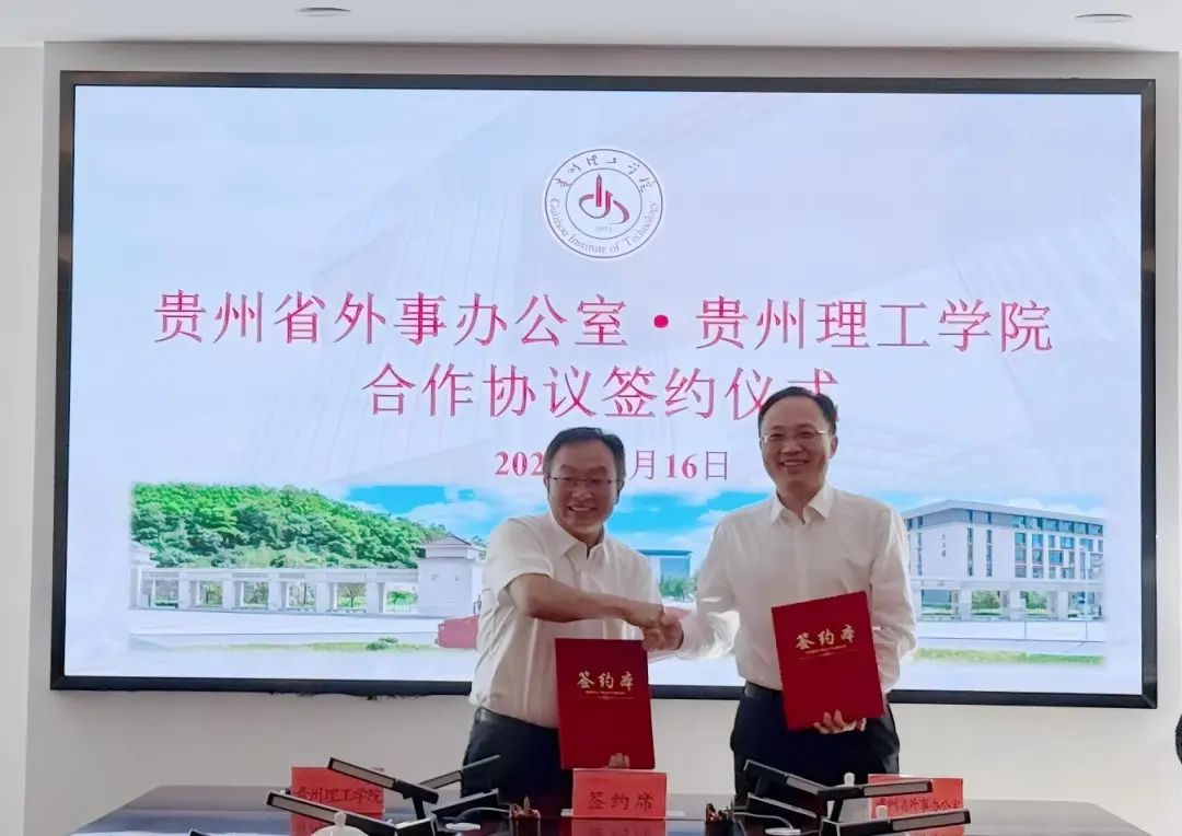 7月16日,贵州省外事办公室与贵州理工学院合作协议签约仪式在知行楼605会议室举行。省外事办党组书记、主任陶平生,省外事办党组成员、省友协专职副会长蒋红,省外事办二级巡视员岑鹏;贵州理工学院党委书记肖建宗,党委副书记、院长潘良明,党委委员、组织部部长左柏州出席,会议由副院长杨鹏主持。双方相关职能部门负责人参加。