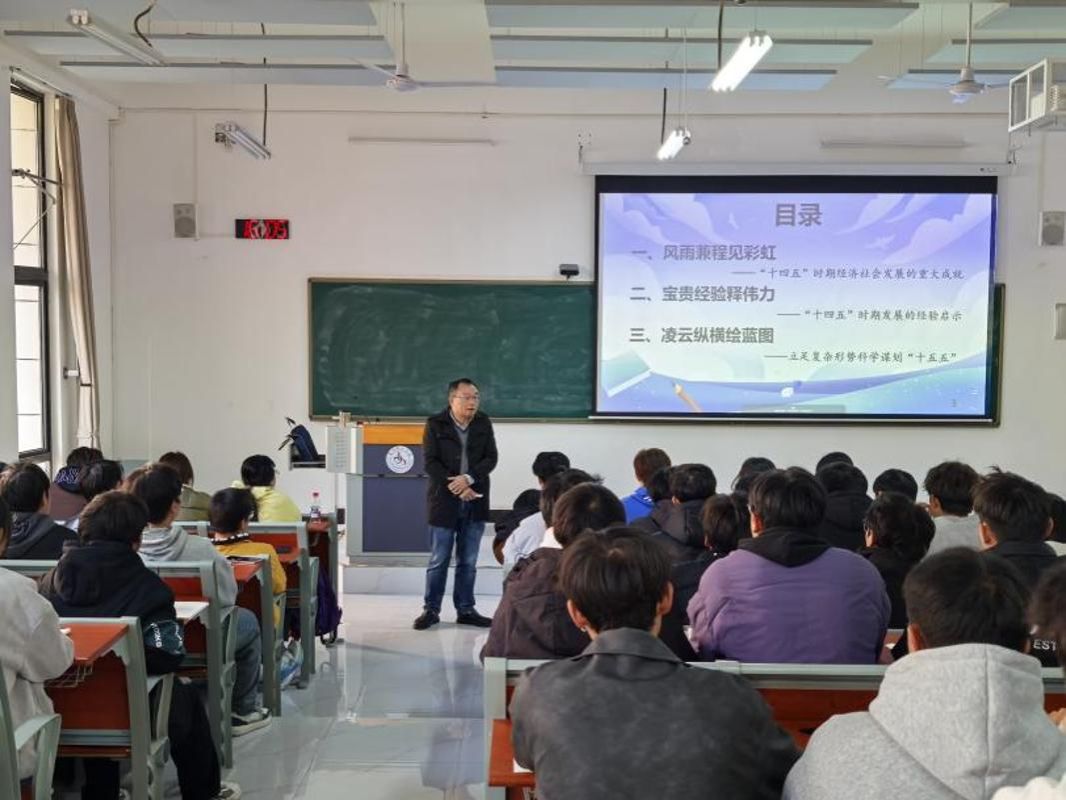 10月25日和11月17日,校党委书记肖建宗分别以 “习近平新时代中国特色社会主义思想” 和“决胜十四五,奋发向前行”为题,为党校第19期发展对象培训班,能器251班、能器252班学生专题授课。他从习近平新时代中国特色社会主义思想的形成背景、科学内涵、重大意义、实践要求四个维度,引导青年学子认清时代大势、坚定理想信念。他结合“十四五”时期我国经济社会发展的重大成就以及经验启示,分析了当前国内外复杂局势以及“十五五”面临的挑战,向同学们阐释了以习近平同志为核心的党中央统筹推进“五位一体”总体布局,贯彻新发展理念,续写了经济快速发展和社会长期稳定两大奇迹新篇章,让学生直观感受国家发展蓝图的实践路径,理解个人成长与国家命运的紧密联系。他勉励同学们始终主动关注国家大事与国际局势,始终同党中央保持高度一致,将专业学习与国家战略需求相结合,为变化蓄势,先行先试,为作为赋能,把个人理想融入中国式现代化建设的宏伟事业中去。