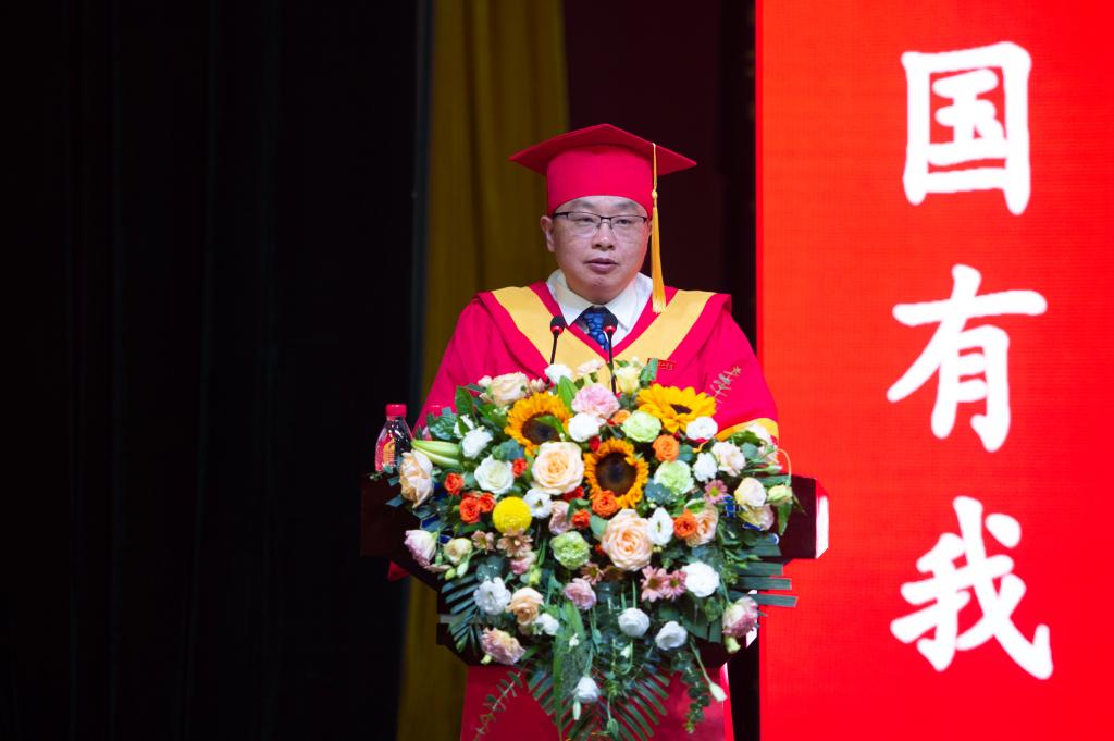 潘良明代表学校向顺利完成本科学业的同学们表示热烈祝贺,向悉心培养同学们的老师致以衷心的感谢。他说回顾过去波澜壮阔的四年,世界格局发生巨变,祖国走向民族全面复兴的新征程。四年间,同学们与学校一起同心抗“疫”,见证中国脱贫奇迹,在建党百年之际喊出“请党放心,强国有我”的时代最强音,这是褪去青涩,磨砺成长的四年,是奠定智慧格局,克服困难阻力的四年。