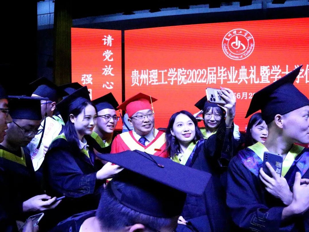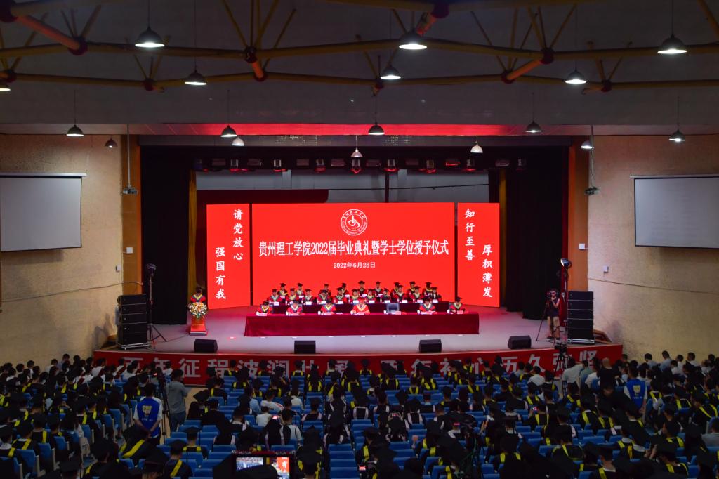 本网讯 6月28日上午9点30分,贵州理工学院2022届毕业典礼暨学士学位授予仪式在逸夫大礼堂举行。校党委委员潘良明、高勇、贺梦依、林长松、张开智、左柏州、李朋以及校学位评定委员会委员,各毕业生学院班子成员,校学位评定委员会委员,全体毕业班辅导员及班主任、毕业生、教师、家长、校友、物业、安保人员代表共同见证了这一时刻。
