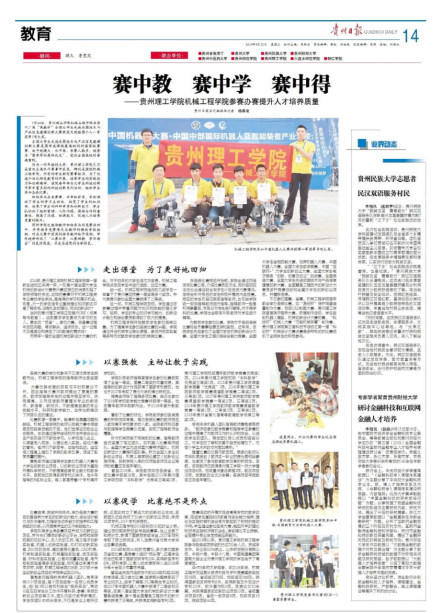学院党总支始终把学风建设作为提高学生综合素质的主要途径,推动了全员育人、全面育人、全程育人格局的形成。学院充分发挥党建育人功能,将党建与学生发展相融合。2名学生党员获“全国优秀共青团员”荣誉称号,3名同学入选“贵州省百佳优秀大学毕业生事迹选编”,20多人获“贵州省优秀学生干部”、“贵州省三好学生”荣誉称号。学生在诸多世界级、国家级、省级、校级赛事中屡获佳绩,世界机器人大赛、中国机器人大赛等国家级以上奖项及荣誉126项,获得机械设计大赛等省级奖项150余项。机自132班团支部获2015年“全国五四红旗团支部”和2016年“全省五四红旗团支部”,机控132班团支部获全省五四红旗团支部,制测141班、机自181班获省级优秀班集体。学院团总支获省级五四红旗团总支荣誉称号。2019年8月21日《贵州日报》围绕学院“以赛促学、以赛促教、以赛促用”的办学特色进行了整版报道。