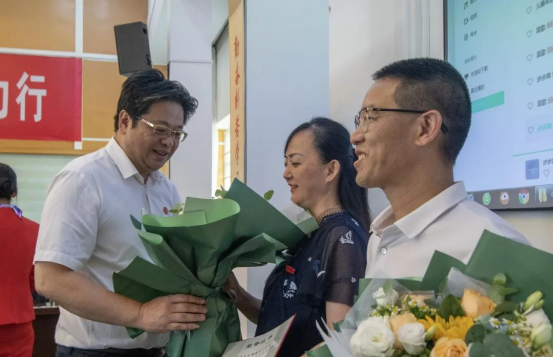 校领导先后为2020年度师德先进个人、2021年优秀教师、优秀教育工作者和荣获30年教龄教师颁奖,并为30年教龄荣誉证书获得者张传艳、黄先伍两位教师献花。