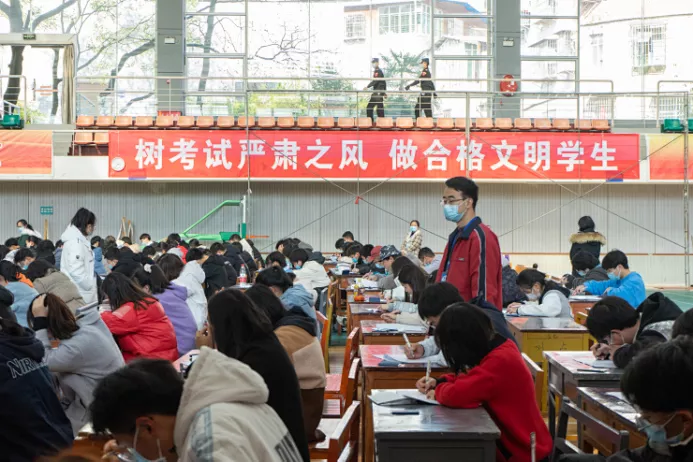 本网讯  为进一步提升教育教学质量,为贵州“四新”“四化”培养合格人才,在学校党委、行政的高度重视下,着力推进提升考风学风行动,通过良好的考风考纪促进学风建设实施,营造公平、公正、诚信考风,保证教学质量进一步提高。2021年12月20日及21日下午,蔡家关校区体育馆举行两场“集中统一考试”,同学们按照疫情防控要求有序进入体育馆各自的考场区域,监考老师整齐到位。下午14:30分,伴随着一声哨响,考试正式开始,经过两个小时的努力,紧张有序的考试顺利结束。校领导苏向东、高勇、张开智,校长助理莫立坡和学生工作处、教务处以及各二级学院负责人到场巡考。