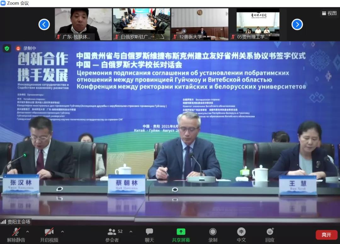 8月25日下午,由贵州省外事办(省对外友协)、贵州省教育厅、白俄罗斯驻广州总领事馆等共同举办的“中国—白俄罗斯大学校长对话会”在线召开。贵州理工学院校长苏向东、副校长胡兴灿、国际交流与合作处负责人受邀出席线上会议。