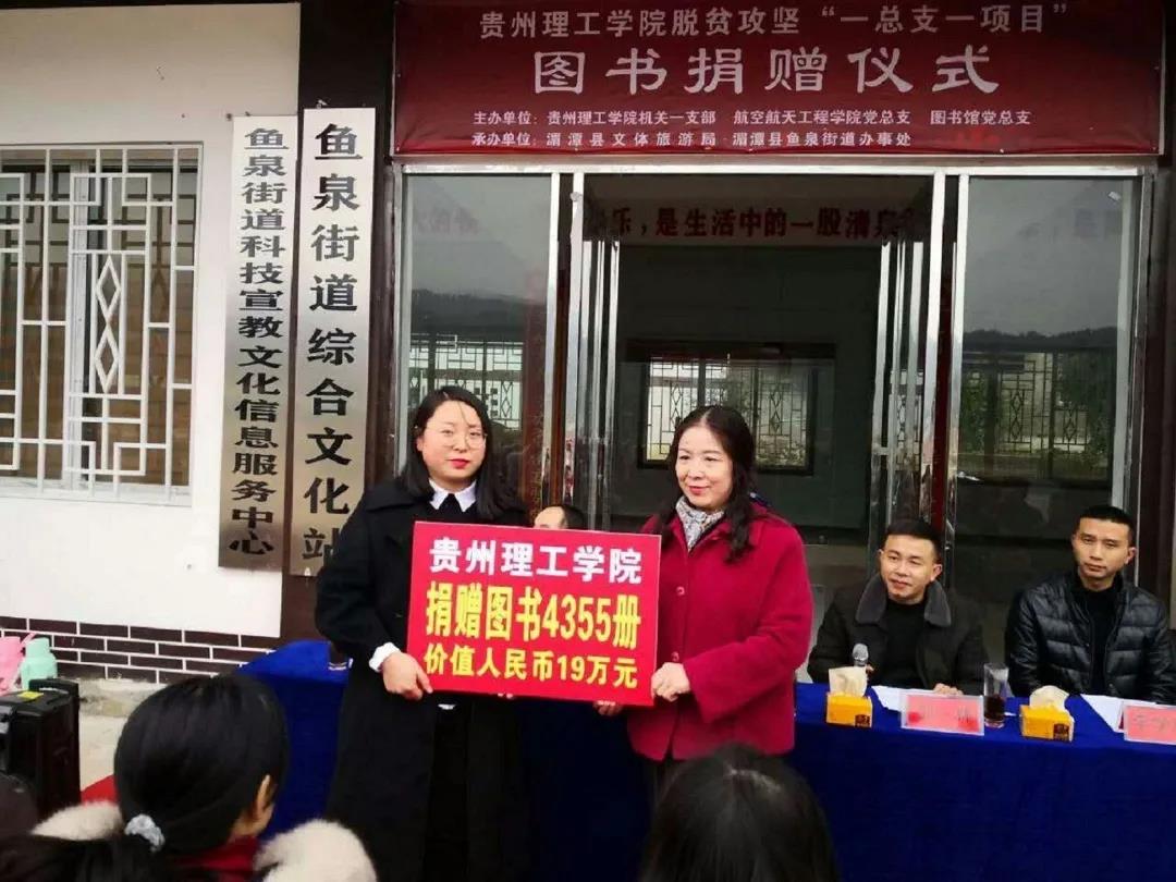 图书馆党总支努力践行全心全意为人民服务的宗旨,凝心聚力打好脱贫攻坚战役,大力实施“一总支一项目”,开展“图书管理培训及图书捐赠扶贫项目”,于2019年12月向湄潭县复兴镇茅台村及湄潭县图书馆捐赠图书共计4355册,并对湄潭县的镇(街)图书馆及农家书屋图书管理员开展图书管理业务培训。