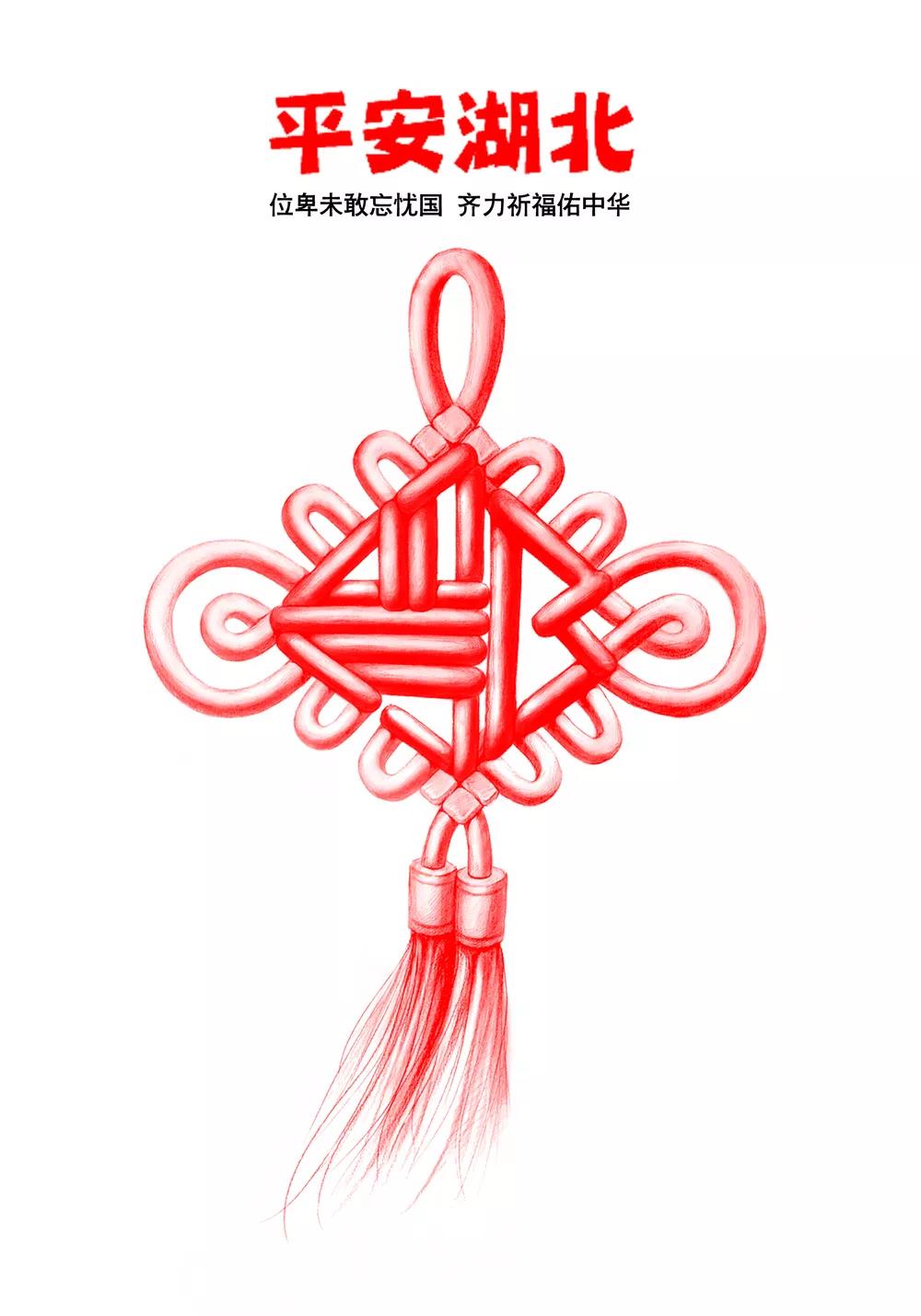 设计说明:在天灾面前,我们显得尤为弱小,我们可能没有办法阻止疫情的发生,但是我们可以控制它的蔓延,到最后战胜它。03年的非典,08年的地震我们都平安挺过去了,这次也一定可以。作为一名大一的学生,我知道我做不了什么,但是我爱我的国。我只有手绘平安结,将湖北、中国放心中,祈福湖北平安、中国平安、所有人都平平安安。