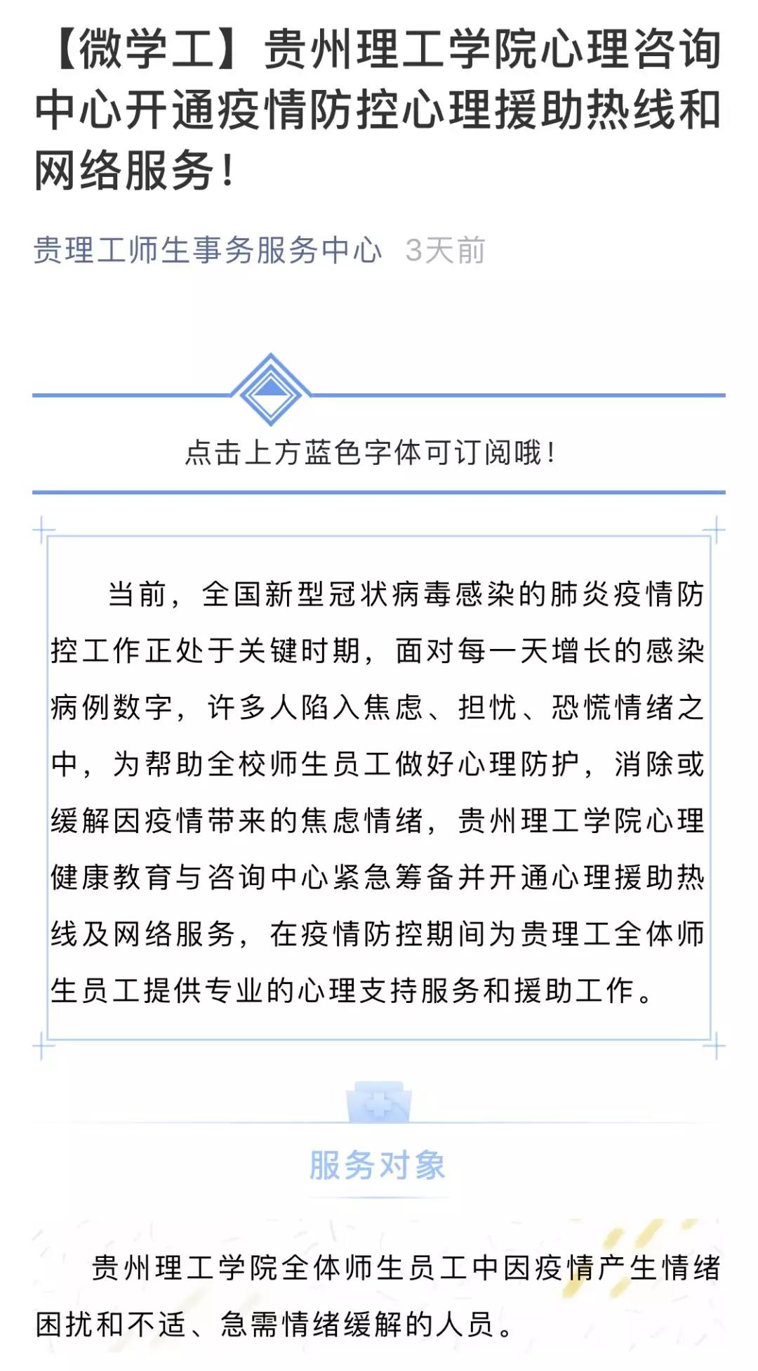 发布《致全体学生及家长的一封信》;开展“理工战‘疫’‧共克时艰”作品征集活动;开通心理危机干预微信平台、QQ群,开展线上心理辅导及心理危机干预工作;制定校内专项资助方案,对因疫情导致家庭经济困难的学生予以及时资助。面对疫情、面对广大师生安全与学校安全稳定,学工战线一直在努力,用我们的方式传递爱、传递信心、传递力量!