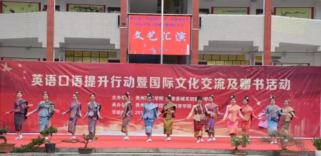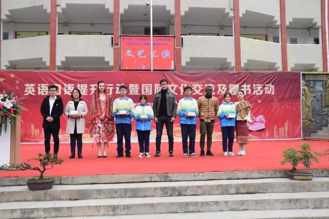 9月25日,湄潭县复兴中学迎来了一批特别的客人,他们来自贵州理工学院大学外语教学部、国际教育学院和经济管理学院,他们此行的目的是与复兴中学共同开展英语才能展暨图书捐赠活动。参加活动的贵州理工学院留学生们走进复兴中学课堂,介绍自己的国家,引发了同学们的好奇与热情;英文文艺汇演上,留学生的异域风情歌舞表演与复兴中学孩子们的英文诗朗诵相得益彰,现场掌声、欢呼声不断。复兴中学的不少同学表示,这此活动增强了他们的英语学习兴趣。出席活动的贵州理工学院党委书记曾羽表示,此次活动的开展,既是两校展开合作的良好开端,也是贵州理工学院开展智力扶贫、积极响应省委省政府决战决胜脱贫攻坚的重要举措之一。贵州理工学院作为一所应用型、地方性普通本科高校,不仅要把大学生培养成才,还应担当起高校的社会责任,为建设社会主义新农村作出应有的贡献。