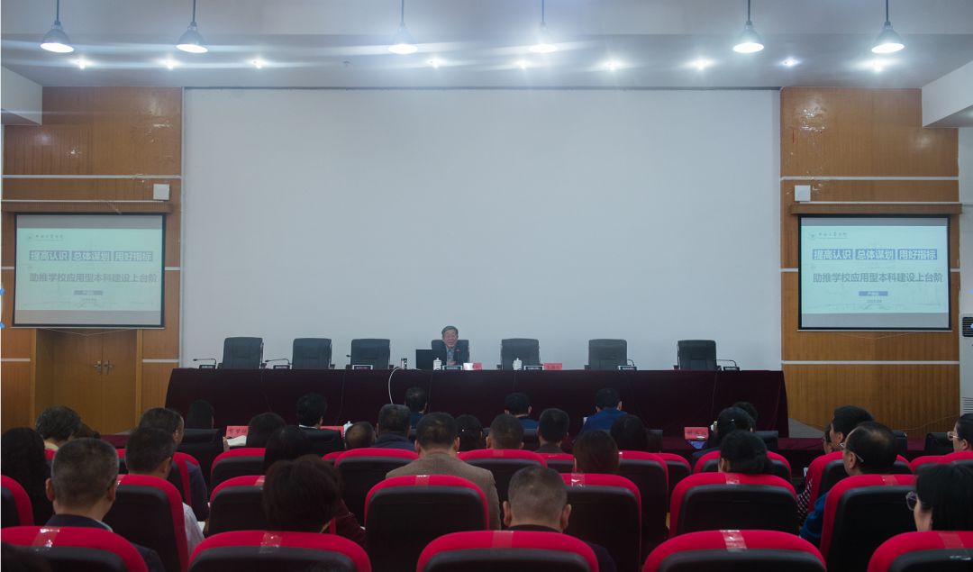 本网讯(党委宣传部 周伟)为进一步提升对本科教学工作合格评估的内涵理解,统一全校上下协力迎评工作的认识,冲刺做好5月20日评估专家咨询会的前期各项工作,4月19日,成都工业学院院长严余松教授受邀做客贵州理工学院,为全体中层以上干部作主题为“提高认识 总体谋划 用好指标——助推学校应用型本科建设上台阶”的专题报告。校领导曾羽、梁杰、张波、苏向东、胡兴灿、贺梦依出席报告会。