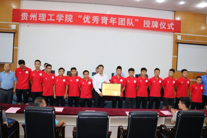 本网讯(党委宣传部记者团 彭晨岚)为激励学校更多青年团队努力拼搏,奋力争先,6月27日,我校大学生男子足球队获贵州理工学院“优秀青年团队”表彰授牌仪式在喀斯特报告厅举行。校领导曾羽、龙奋杰、张波,共青团贵州省委副书记丁毅受邀出席授牌仪式。仪式由副校长梁杰主持。