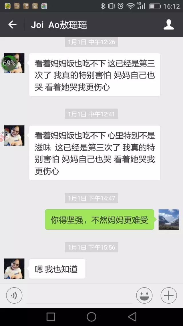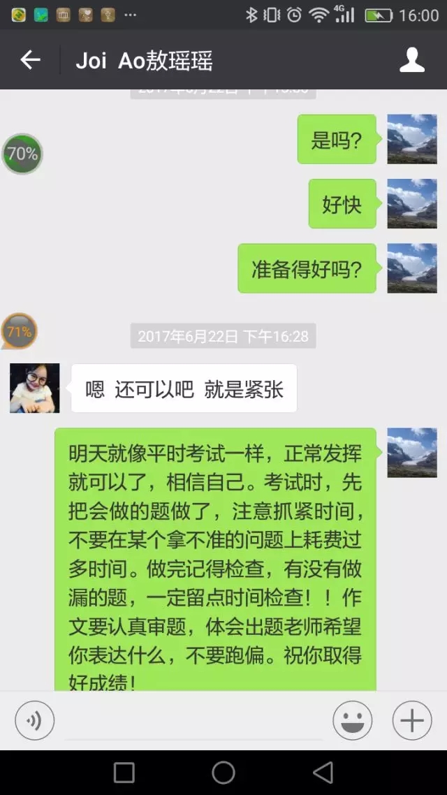 在人生成长关键时期得到的关爱和帮助,往往会对年轻人产生更大的积极的影响。转眼就要中考了,敖瑶瑶第一次面对学业生涯中的大事儿,紧张、不安以及面对不同的人生选择,不仅是她自己心中的焦虑,也让身处异乡的陈海虹教授忧心不已。“明天就像平常考试一样,正常发挥就可以了,相信自己。”“就按平时的作息时间,晚上不要复习了,放松!”……微信对话的字里行间中,处处渗透着陈海虹教授对敖瑶瑶的关心,如同一位母亲对女儿的关爱。