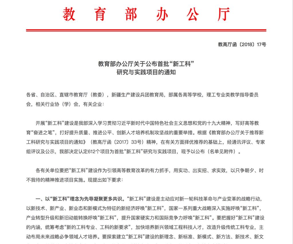 开展“新工科”建设是教育部深入学习贯彻习近平新时代中国特色社会主义思想和党的十九大精神,写好高等教育“奋进之笔”,打好提升质量、推进公平、创新人才培养机制攻坚战的重要举措。根据《教育部办公厅关于推荐新工科研究与实践项目的通知》(教高厅函〔2017〕33号)精神,在有关方面择优推荐的基础上,经通讯评议、专家组评议及公示后认定。