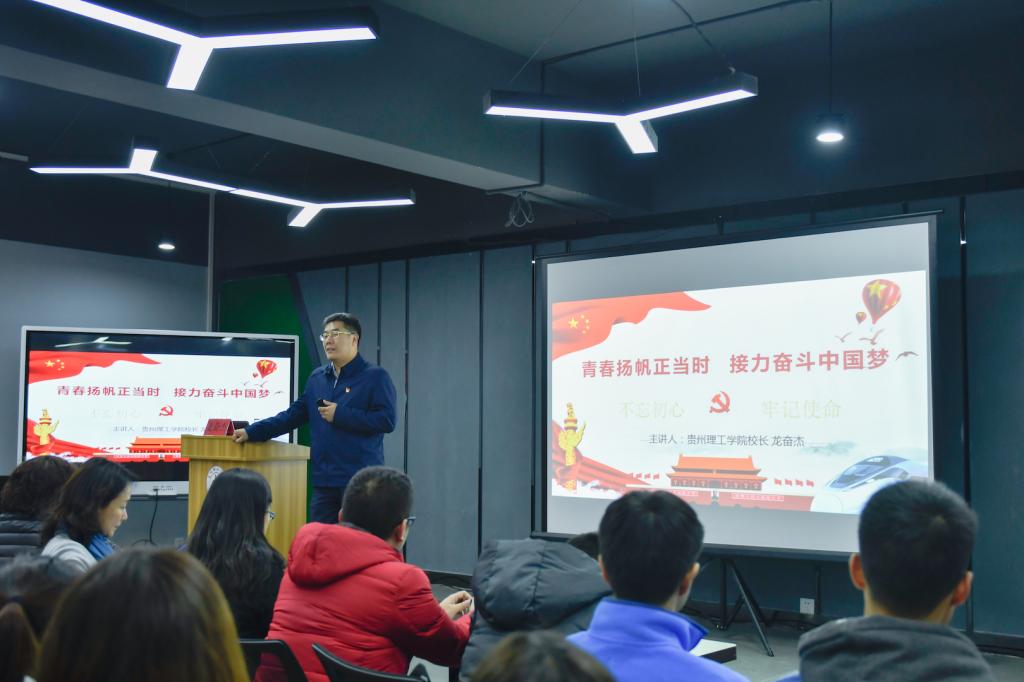 本网讯(校办 郝飞)为深入学习宣传贯彻党的十九大精神,全面落实十九大精神进校园、进课堂以及《贵州理工学院校院两级班子成员任班级导师制度》的相关要求,12月6日下午,在创新创业中心路演厅校党委副书记、校长龙奋杰作为班级导师为造价142班、酿酒153班、大数据172班全体同学宣讲党的十九大精神。学院办公室、学生工作部(学生处)负责人,食品药品制造工程学院、经济管理学院、大数据学院党总支书记参加学习。