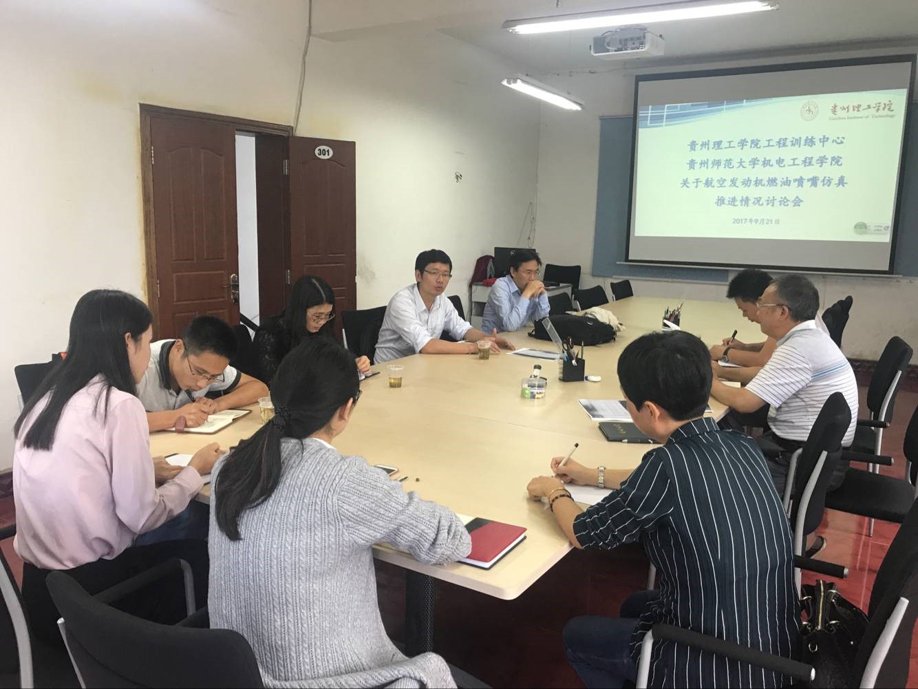 本网讯(工程训练中心 卢燕)9月21日下午3点,贵州师范大学机电学院书记郑继明、副院长伍权一行到就关于推进航空发动机燃油喷嘴仿真方案进行研讨。我校工程训练中心副主任高兴勇、钟晓峰以及相关老师参加了研讨会。