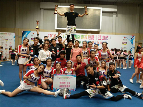 贵州理工学院“疯狂鼠”啦啦操代表队24名队员,作为贵州省唯一的一支参赛队在教练员林丽、苏雪姣、牟玥等几位老师的带领下,组建了3支参赛队伍,他们利用课余、周末、节假日等时间刻苦训练,积极备战。赛场上,凭借整齐划一的规范动作和积极向上的精神面貌,获得了青年丙组双人街舞自选动作、青年丙组集体街舞自选动作、青年丙组花球自选动作3个项目的冠军,由于表现出色,赛事组委会给我校颁发了派遣函,获得代表中国参加2017-2018年国际啦啦操系列赛事的资格。