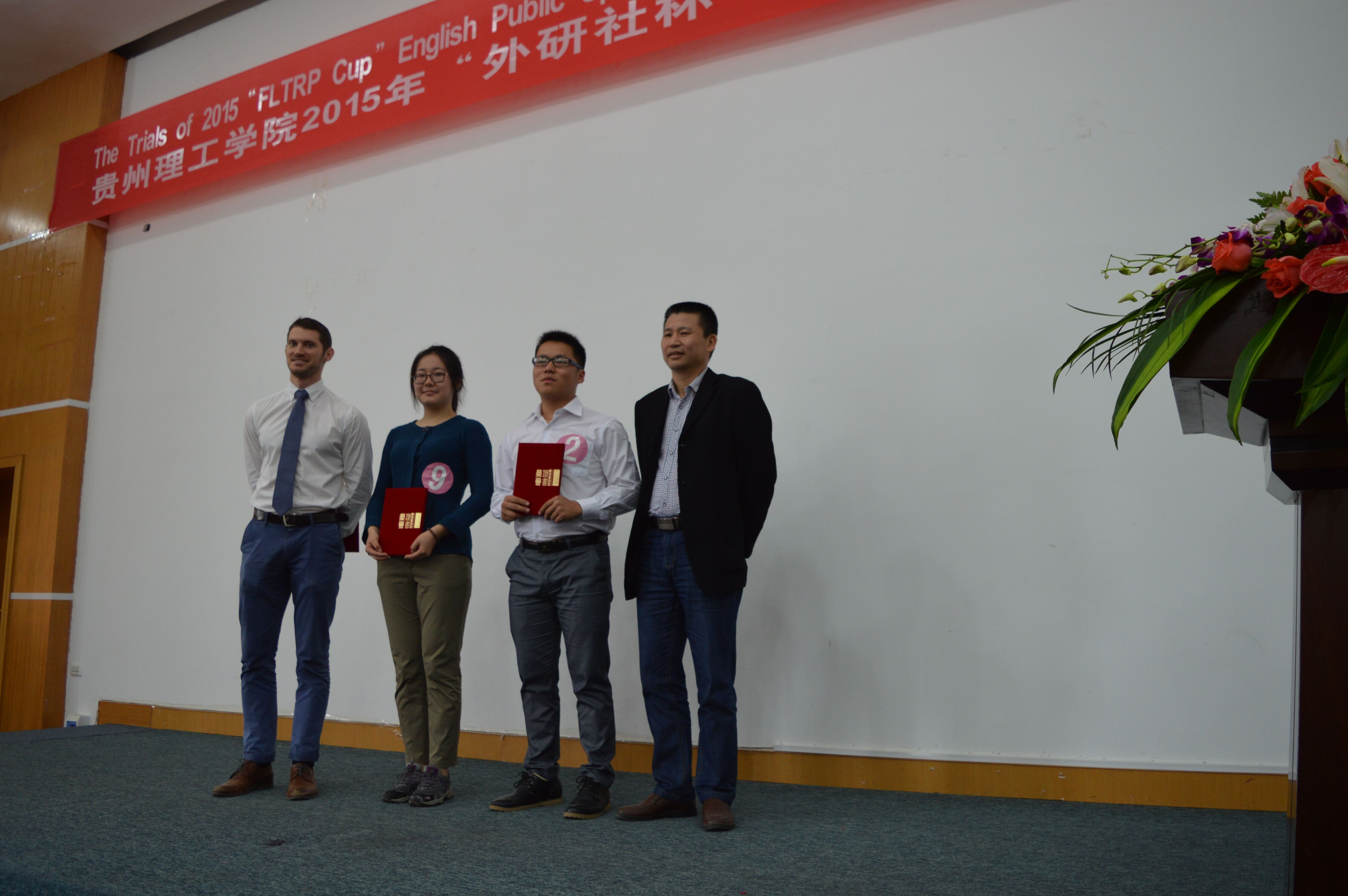 本网讯(大外部 冯建平) 10月24日上午,贵州理工学院2015年“外研社杯”英语演讲大赛在喀斯特报告厅举行。贵州大学外国语学院副院长洪云教授、贵州民族大学外国语学院院长肖唐金教授、贵阳学院外国语学院院长孟俊一教授以及我校大外部副主任周丽副教授、外教Adam担任比赛评委。演讲比赛决赛遵照全国“外研社杯”英语演讲大赛的规则,分为定题演讲、现场回答问题和即兴演讲三个环节。