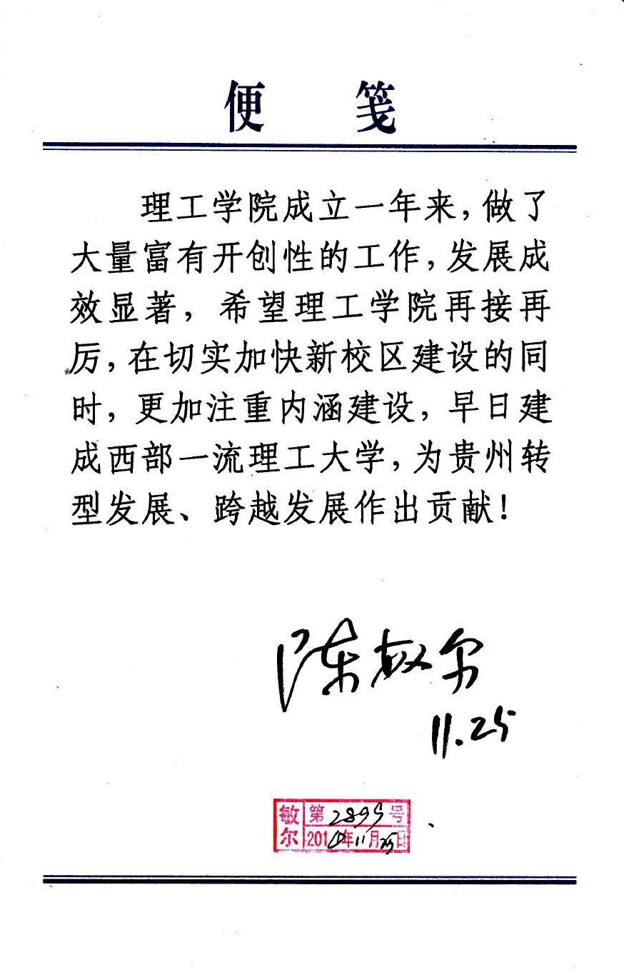 陈敏尔省长在批示中指出,“理工学院成立一年来,做了大量富有开创性的工作,发展成效显著”,勉励我校“希望理工学院再接再厉,在切实加快新校区建设的同时,更加注重内涵建设,早日建成西部一流理工大学,为贵州转型发展、跨越发展作出贡献”。
