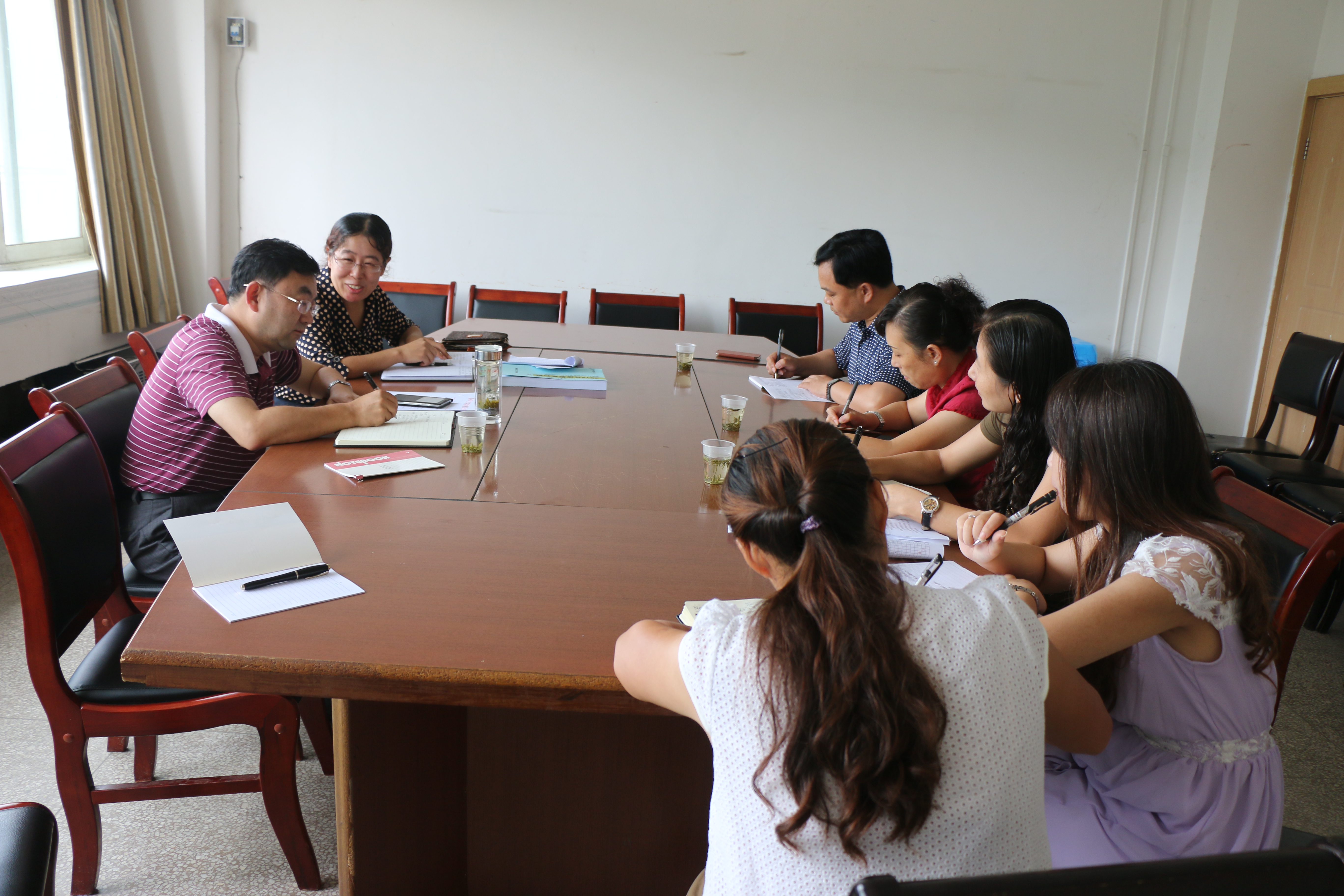 调研会上,资环学院院长聂爱国对学院各项工作进行了简要汇报,并就教师进修计划、教师档案建设、教学管理目标考核、混合教学模式开展等情况与教务处相关负责人进行了交流。