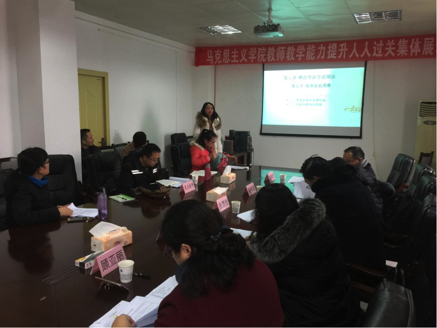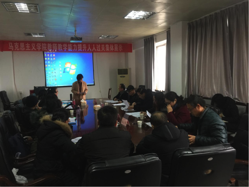本网讯(马克思主义学院 刘玲/文 张建军/图)2018年12月14日,马克思主义学院在1125会议室举办教师教学能力提升人人过关集体展示活动,活动邀请了贵州大学马克思主义学院院长张国安、贵州财经大学马克思主义学院院长何伟福、贵州中医药大学马克思主义学院副院长刘维民以及贵州理工学院教务处处长邵芳,教务处副处长、创新创业中心主任顾亚丽担任评委。学院形势与政策教研室主任孙瑞老师主持展示活动,马克思主义学院全体教职工参加。