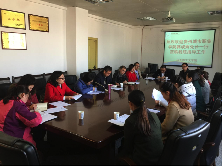 本网讯(马克思主义学院 刘玲/文 张建军/图)11月23日,贵州城市职业学院教务处韩成娇处长一行到我校马克思主义学院进行教学交流。教务处相关负责人、马克思主义学院班子成员及各科室负责人参加了交流座谈。