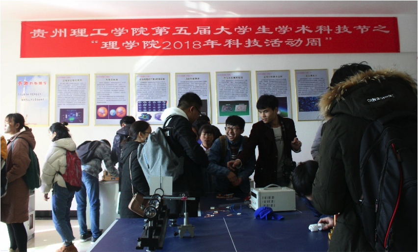 本网讯(理学院 陈数晖/文 杨庆/图)为进一步弘扬科技创新精神,传播科学知识,增进大学生对科学技术的理解和认知,培养学生的创新精神和专业能力,由校团委、双创中心联合主办,理学院承办的贵州理工学院第五届大学生学术科技节之“理学院2018年科技活动周” 集中展示于2018年11月23日上午10点在第三实验楼理学院实验室中厅顺利开展。来自我校各个学院的诸多同学如约而至,参与科技节活动现场体验。